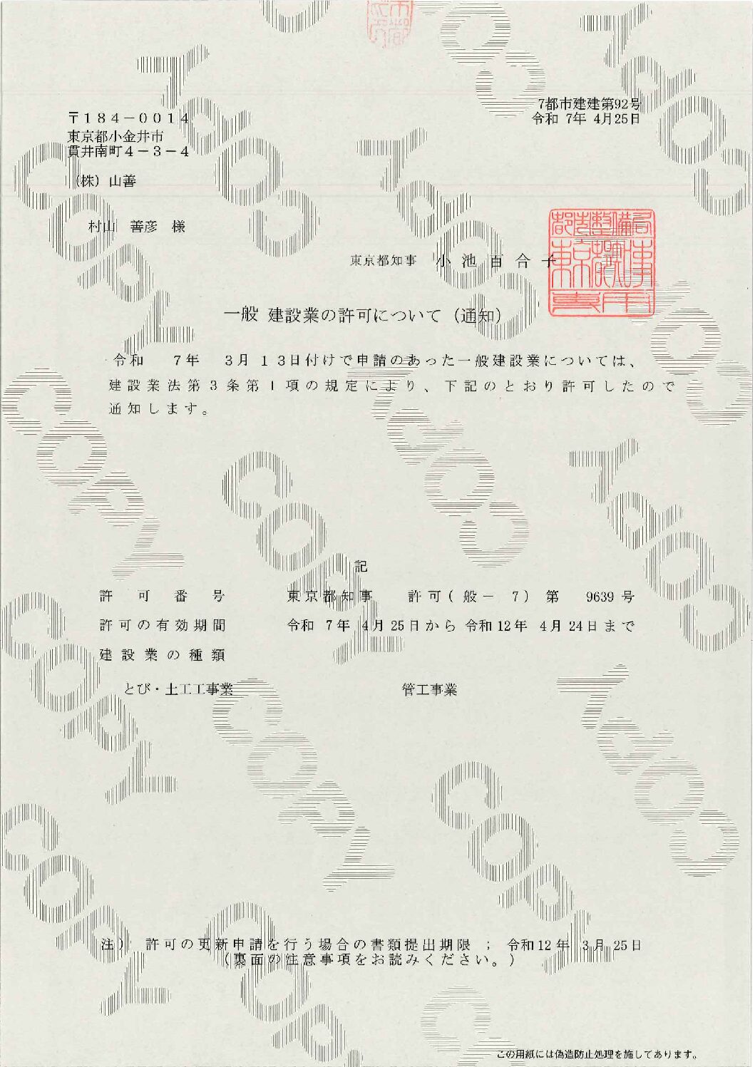 東京都知事(般 -2)第 9639 号 / 管工事/とび・土工工事業